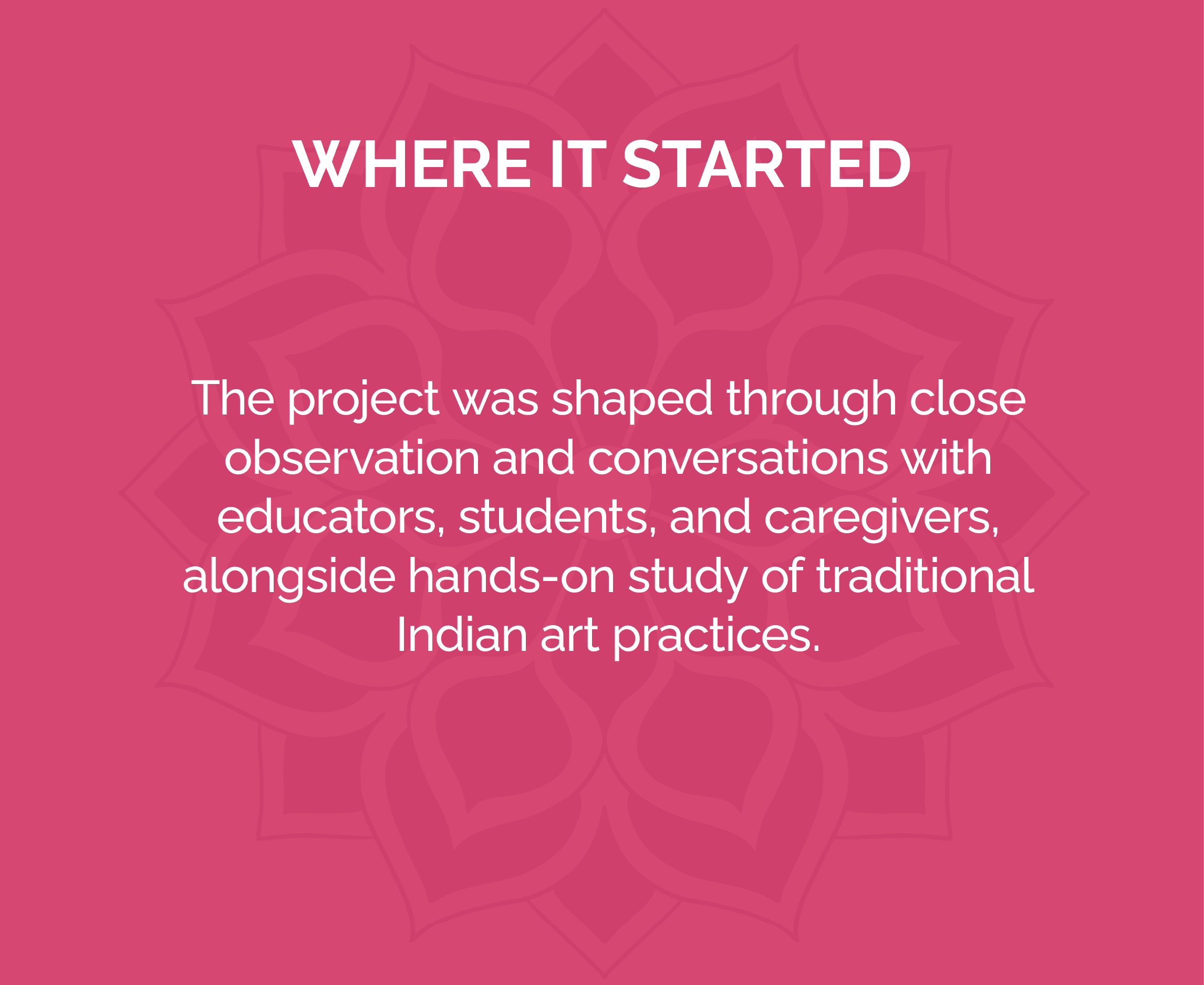 Traditional art forms like Gond, Warli, Mandana, and Lippan were broken down into their most recognizable elements such as patterns, textures, symbols, and rhythms. These elements were then translated into interactive formats that encouraged touch, movement, and repetition.
