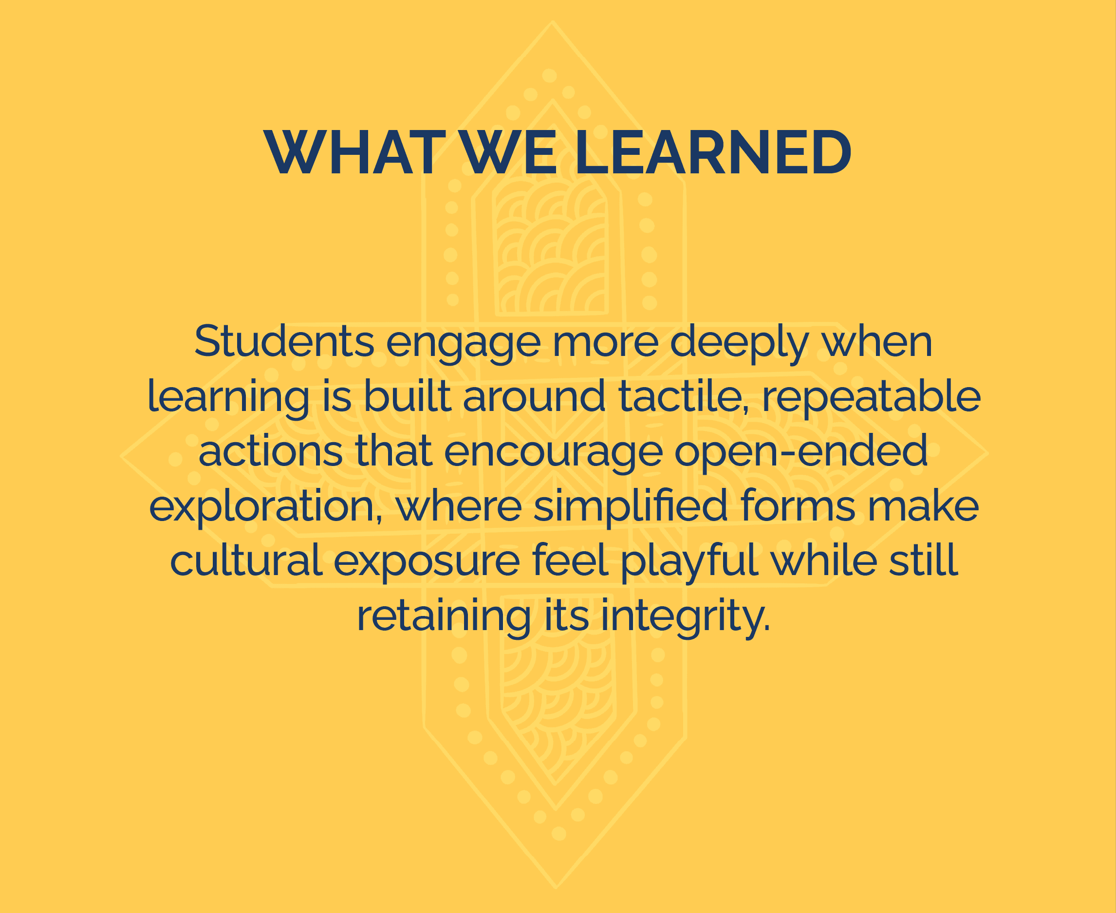 The activities led to noticeably higher engagement during sessions, improved fine motor interaction, and a more intuitive entry point into cultural learning. Educators noted that students were more curious, willing to explore independently, and emotionally connected to the activities.
